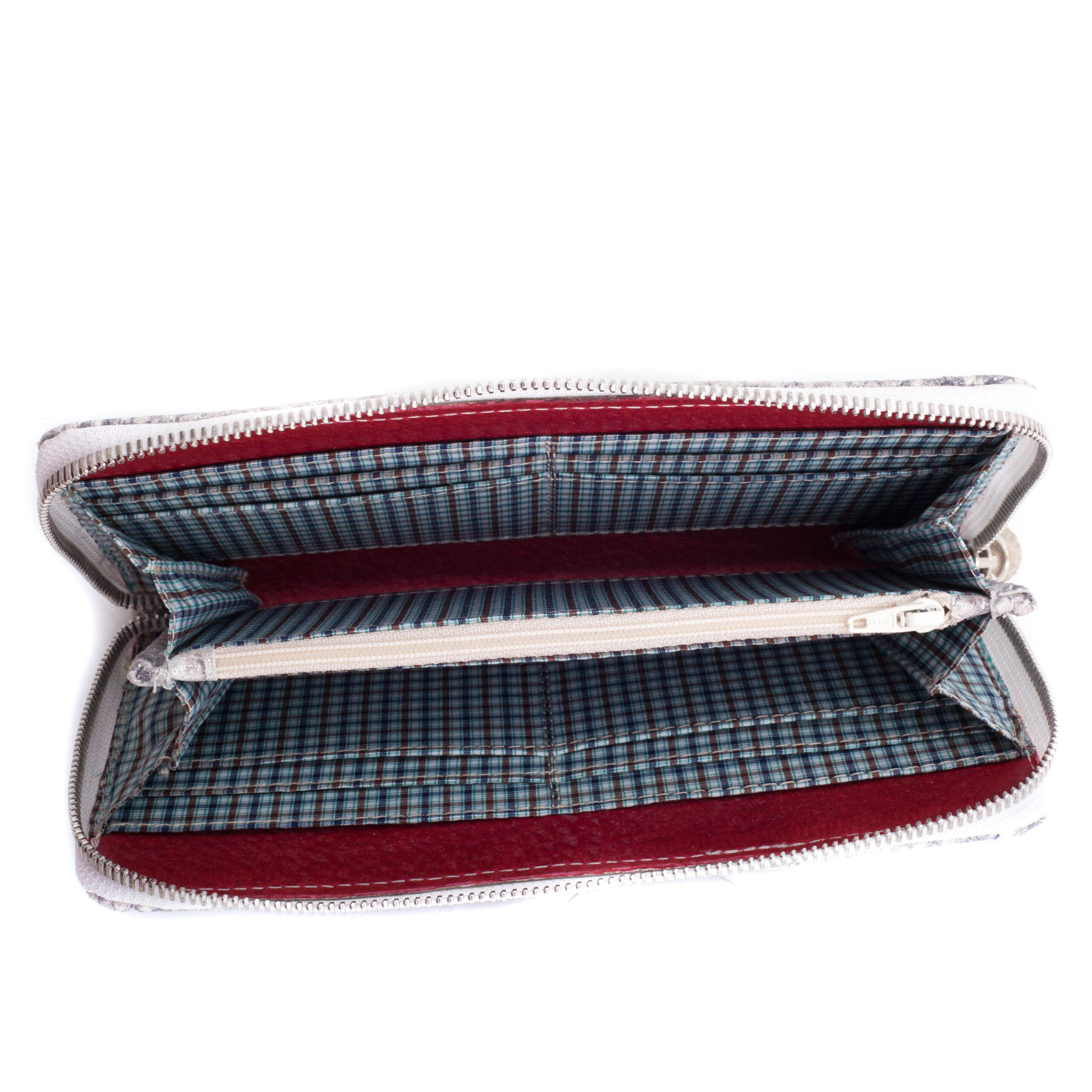 Interiorul este compartimentat inteligent: sloturi pentru carduri, un buzunar separator cu fermoar pentru monede si spatiu generos pentru documente si bancnote.