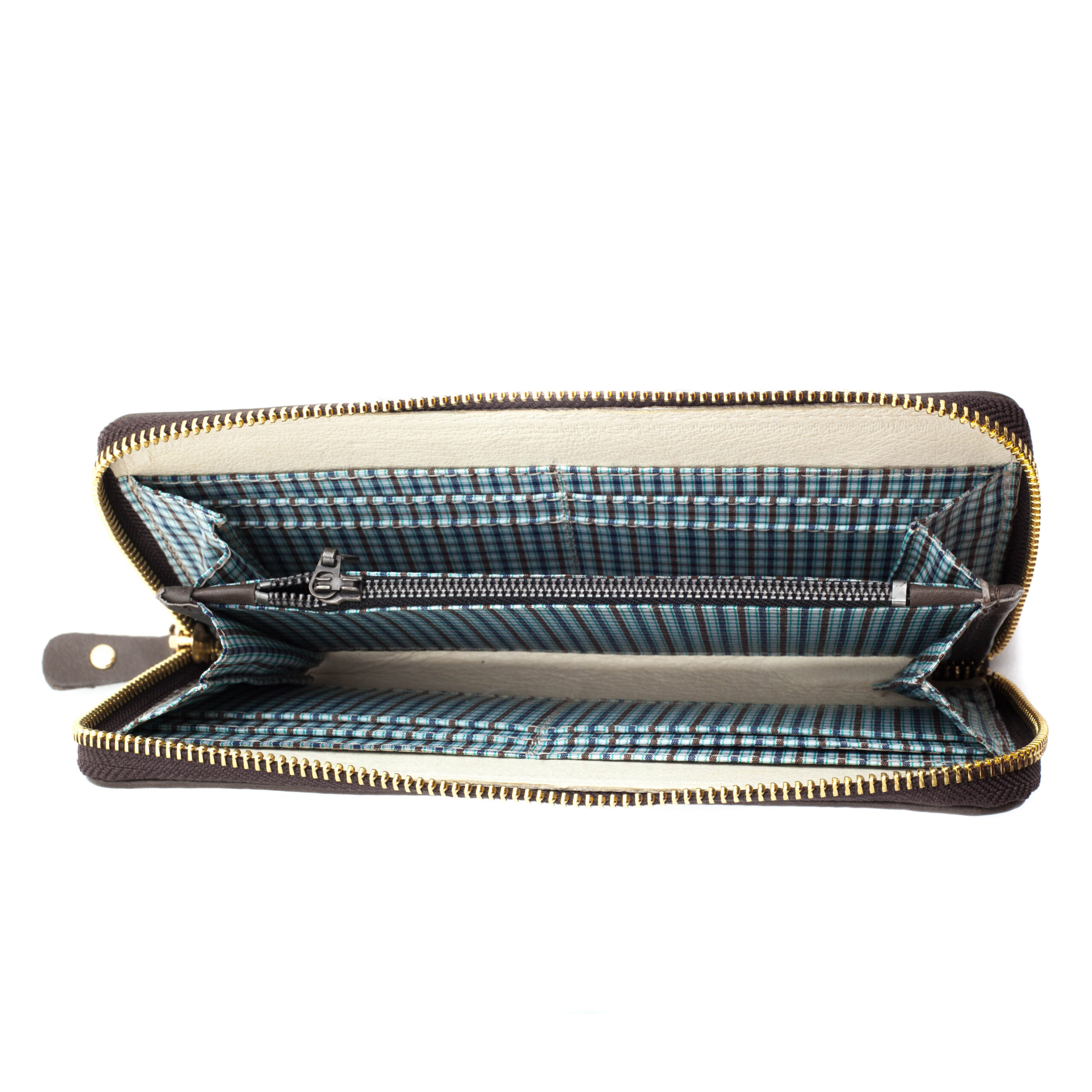 Interiorul este compartimentat inteligent: sloturi pentru carduri, un buzunar separator cu fermoar pentru monede si spatiu generos pentru documente si bancnote.