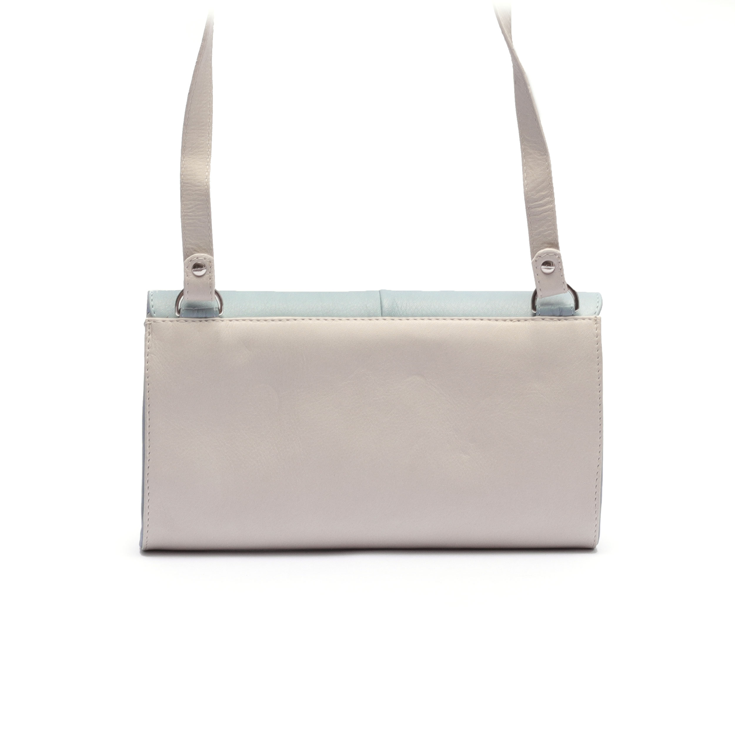 Realizata din piele naturala albastra si alba, poate fi purtata pe umar, cu lantul metalic fin, sau ca plic de mana. Inchiderea sigura cu doi magneti si buzunarul interior aplicat pastreaza obiectele esentiale la indemana.
