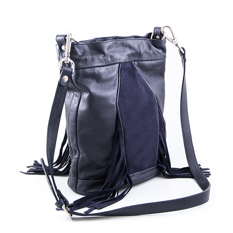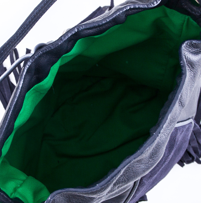 Pielea naturala moale si franjurii lungi creeaza un joc de miscare care atrage privirile fara efort. Forma lejera, tip sac, pastreaza acel echilibru intre relaxat si sofisticat.